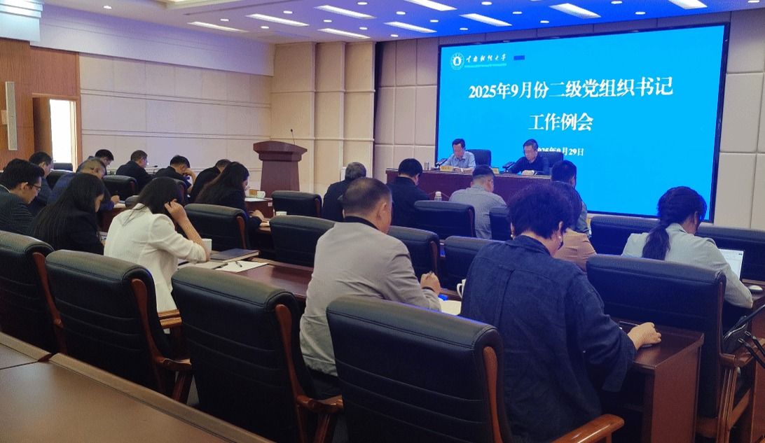 9月29日,学校召开9月份二级党组织书记工作例会,传达学习习近平总书记在新疆维吾尔自治区成立70周年庆祝活动上的重要讲话精神,安排部署近期重点工作。校党委副书记施仲军主持会议并讲话,校纪委书记、监察专员业光远开展警示教育并安排布置中层干部集中调整纪律监督工作。