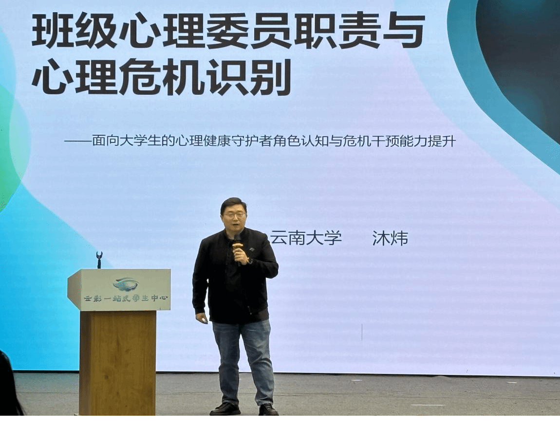 本次活动特邀昆明医科大学附属精神卫生中心康复治疗中心主任合浩、昆明市精神病院精神科主任医师龚毅和云南大学学生工作部心理健康咨询服务中心教师沐炜到校开展专题讲座。学生处处长沙磊、副处长张波、心理教育与咨询中心全体教师及各学院辅导员代表、2025级全体心理委员共同参与,凝聚共识、共话成长。