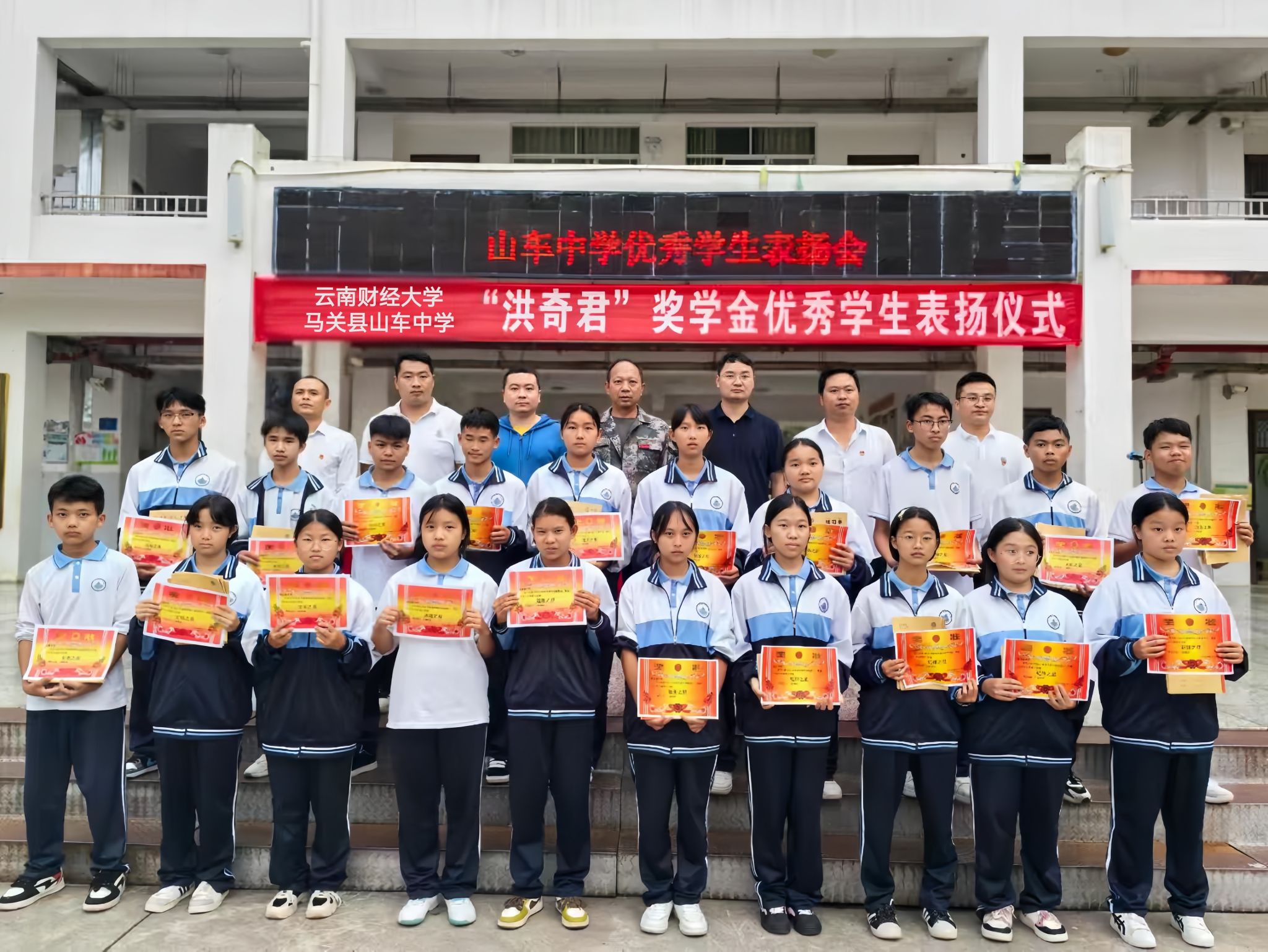 10月20日下午,马关县山车中学举行了首届洪奇君奖学金优秀学生表扬仪式。洪奇君奖学金由云南财经大学优秀校友、深圳校友会副会长兼秘书长洪奇君捐资设立,旨在支持乡村教育发展,激励乡村学子成长成才。