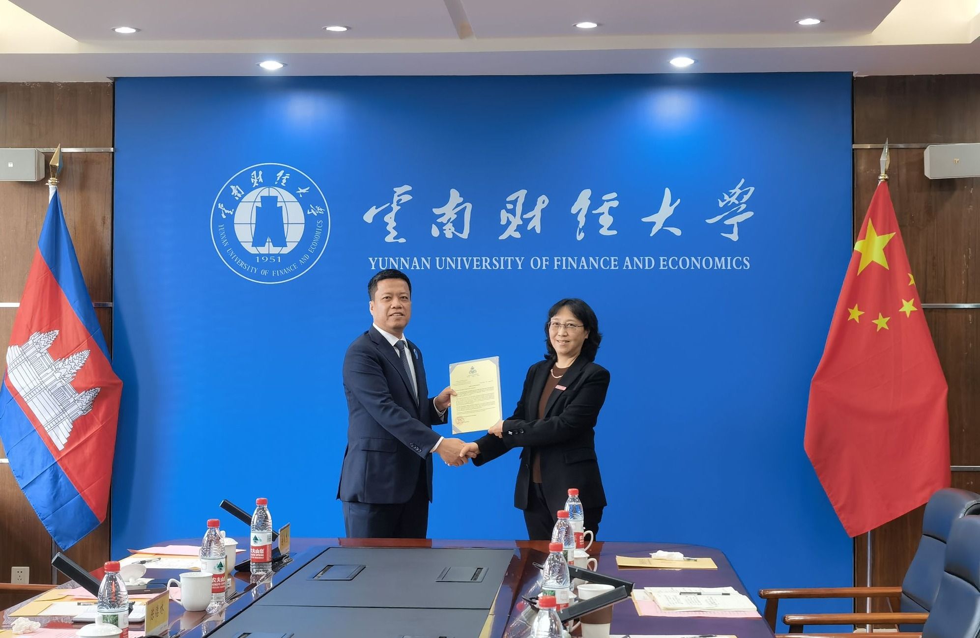 索素昂感谢云南财经大学对柬埔寨学生的接纳与培养,并介绍了洪森亲王及夫人奖学金协会的相关情况。他指出,人力资源的开发与发展是柬埔寨政府的首要战略,近年申请赴华留学人数显著增长,充分体现柬埔寨学生对中国高等教育的认可与向往。今后协会将继续严格遵照标准化流程为学校输送优质学生,希望未来能与我校进一步扩大合作。