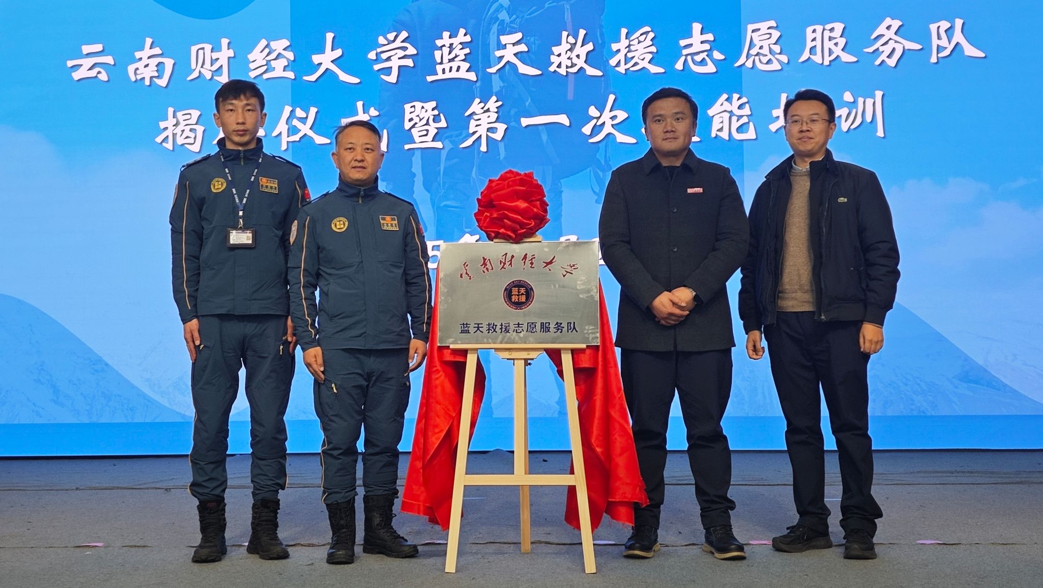 12月25日,云南财经大学蓝天救援志愿服务队揭牌仪式暨首次技能培训在龙泉路校区举行,学生处处长沙磊与昆明蓝天应急救援中心常务副队长朱怀亚共同为志愿服务队揭牌。