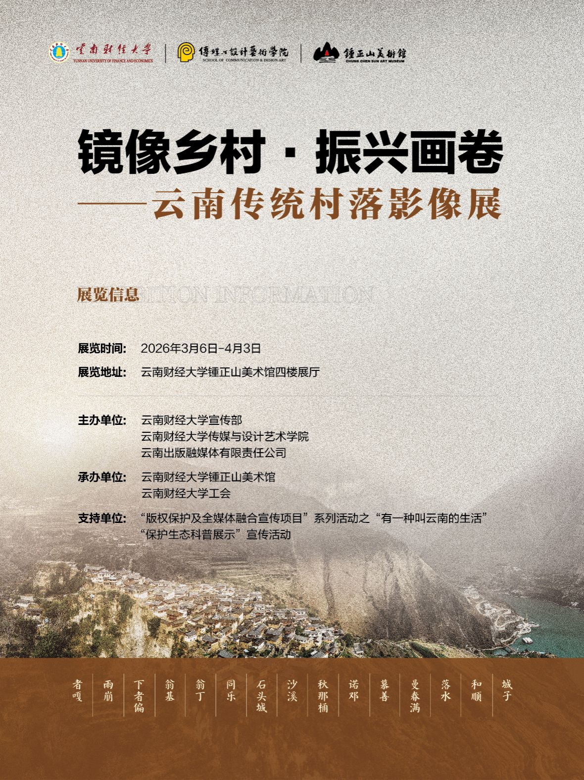 为展现云南传统村落的多彩风貌与深厚底蕴,助推乡村文化振兴,由云南财经大学宣传部、传媒与设计艺术学院及云南出版融媒体有限责任公司主办,云南财经大学锺正山美术馆、云南财经大学工会承办的“镜像乡村·振兴画卷”云南传统村落影像展于3月6日在锺正山美术馆开展,展览将持续至4月3日。