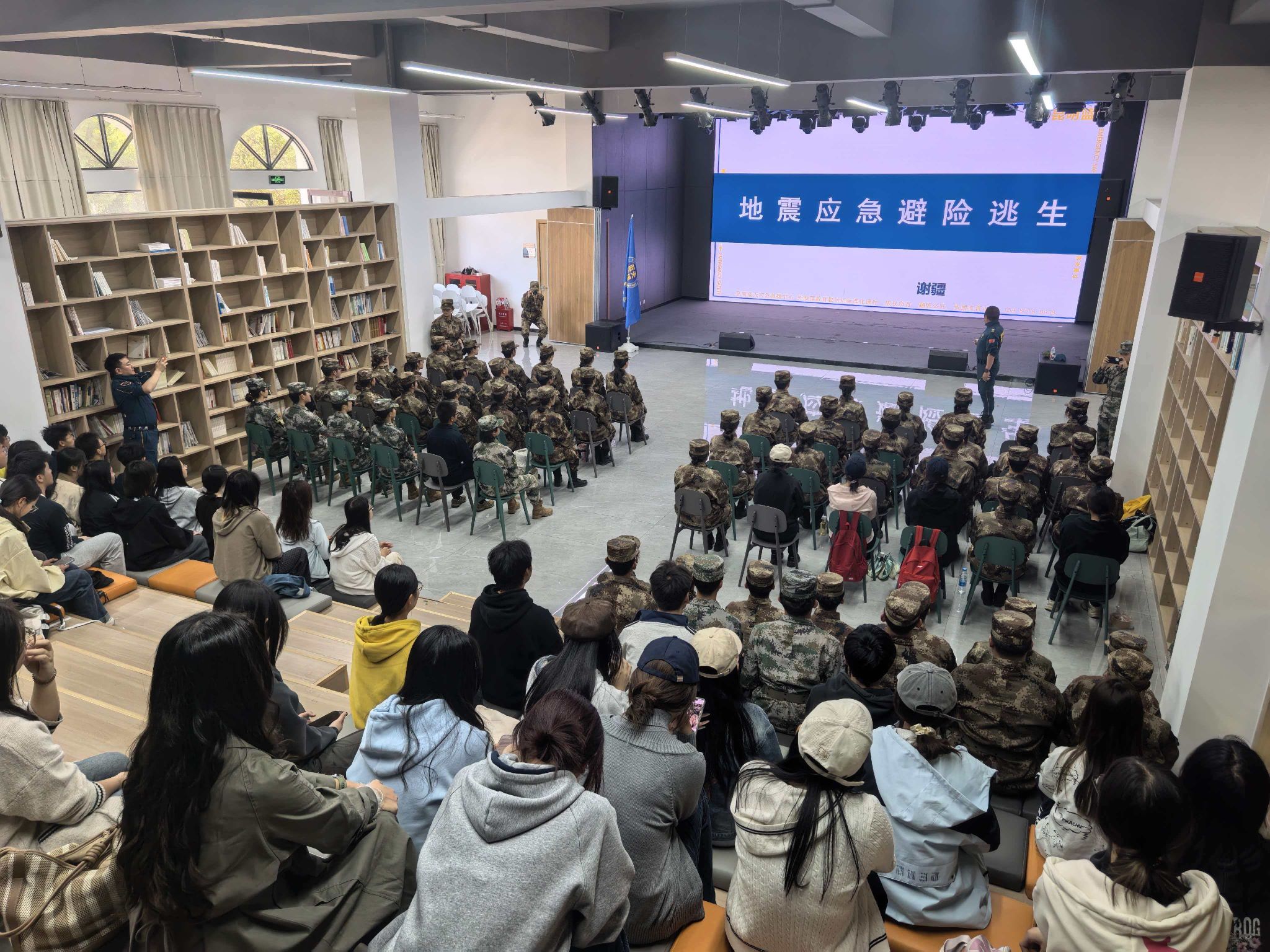 3月20日下午,应学校武装部邀请,昆明市蓝天救援队在龙泉路校区云彩“一站式”学生中心,为强军社社员及校团委青年志愿者共150人开展地震应急避险逃生专项培训。