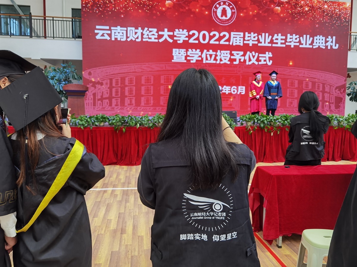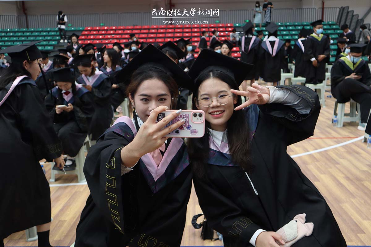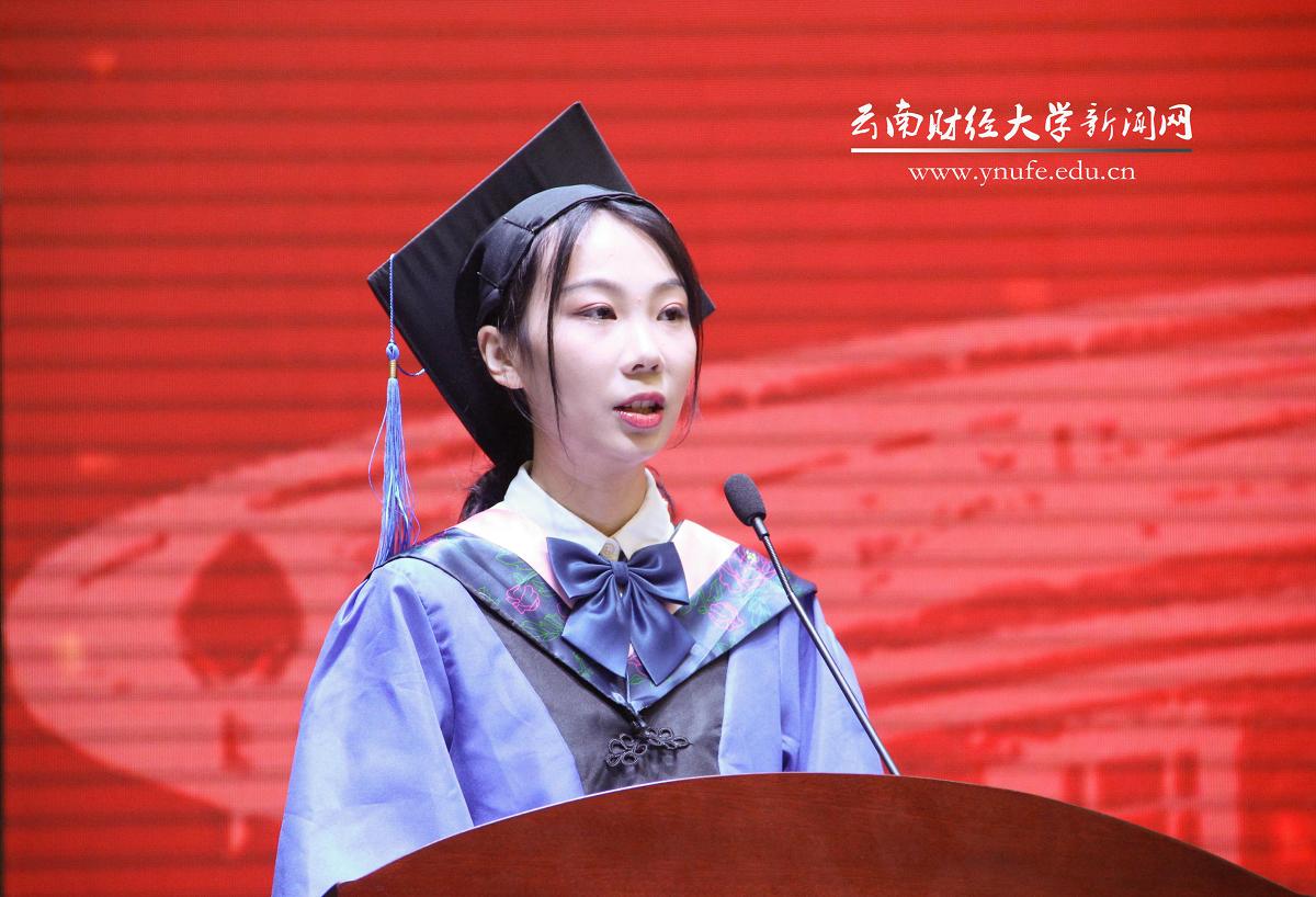 本科生代表、来自国际语言文化学院英语18-1班的尉俊莹同学表示,从今以后,无论是继续深造,还是走向社会,都要昂首挺胸,脚踏实地秉承“好学笃行 厚德致远”的云财校训,践行“自强不息 敢为人先”的云财精神。旅游与酒店管理学院的杨芷婷同学表示,作为云财学子,无论身处何方,定将不负时代、不负韶华,努力成为堪当民族复兴大任的时代新人。