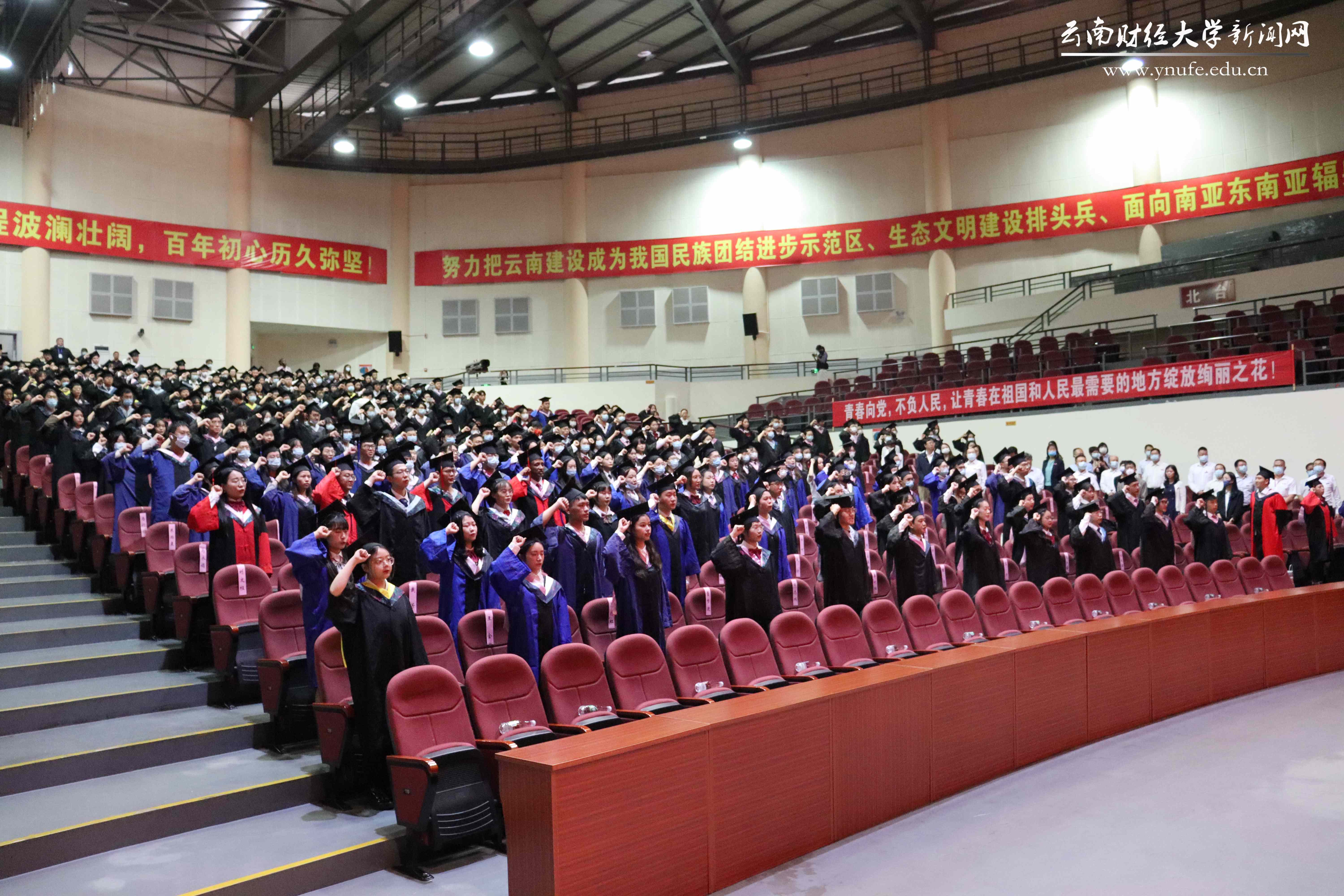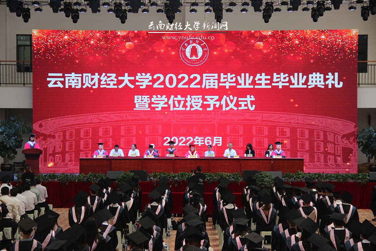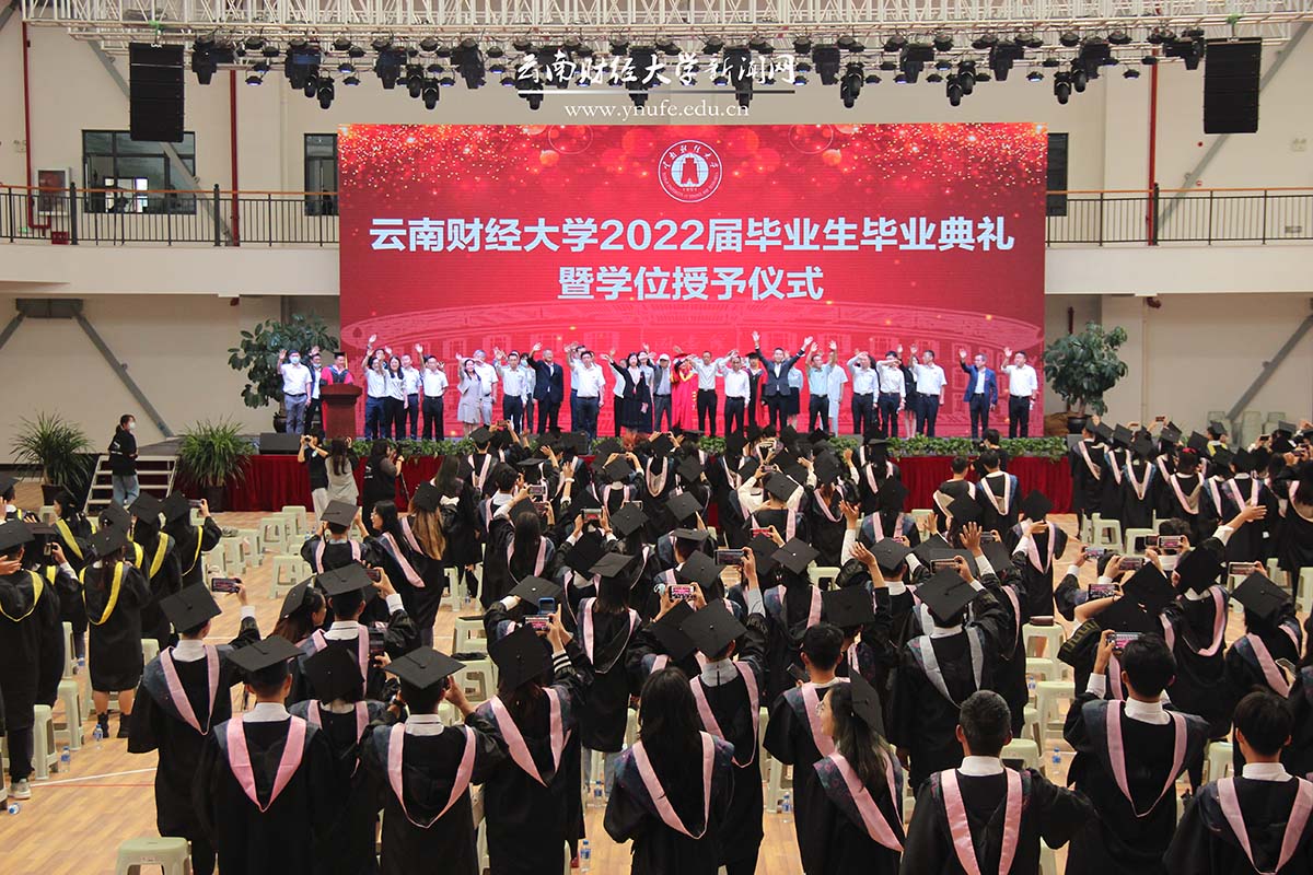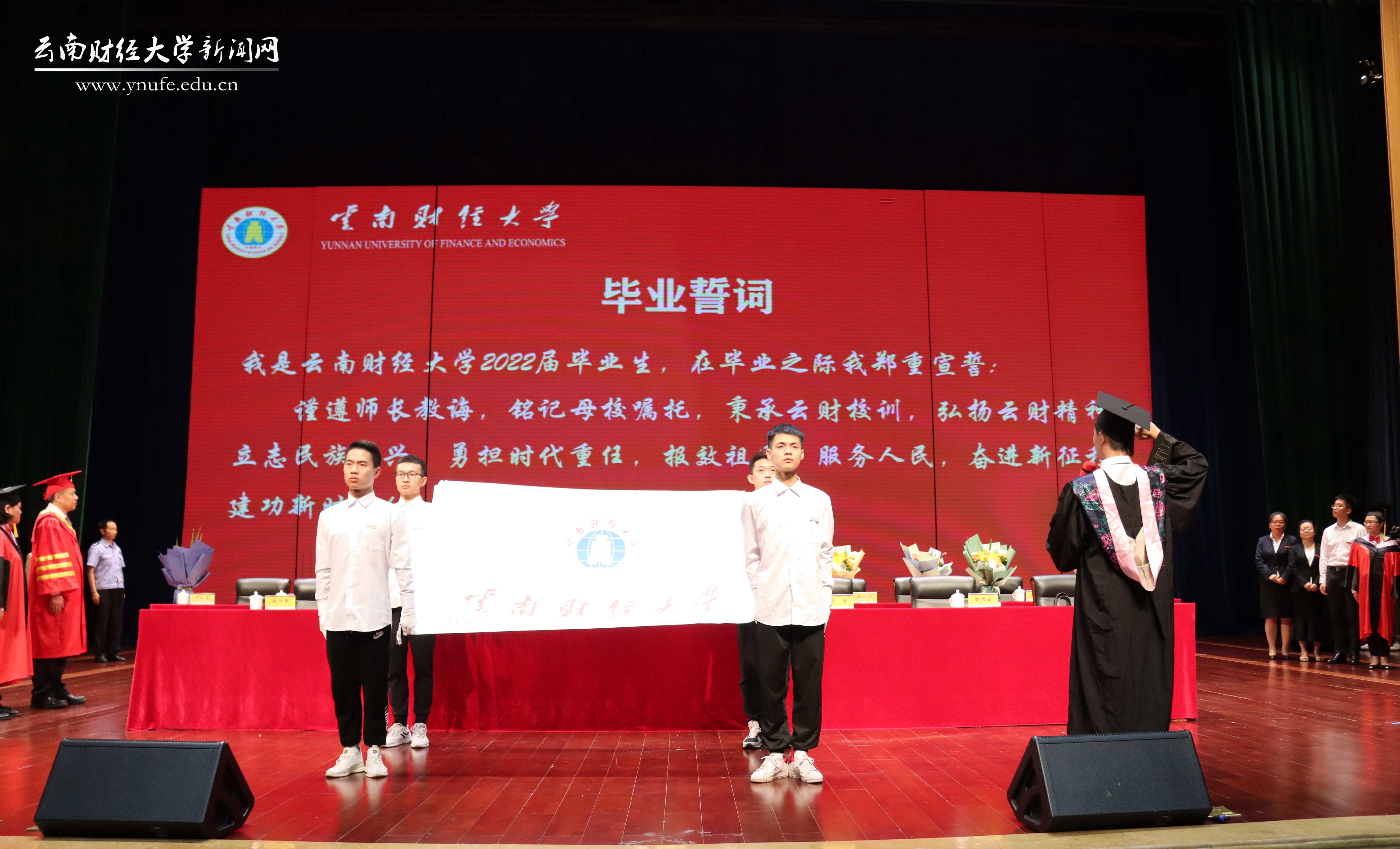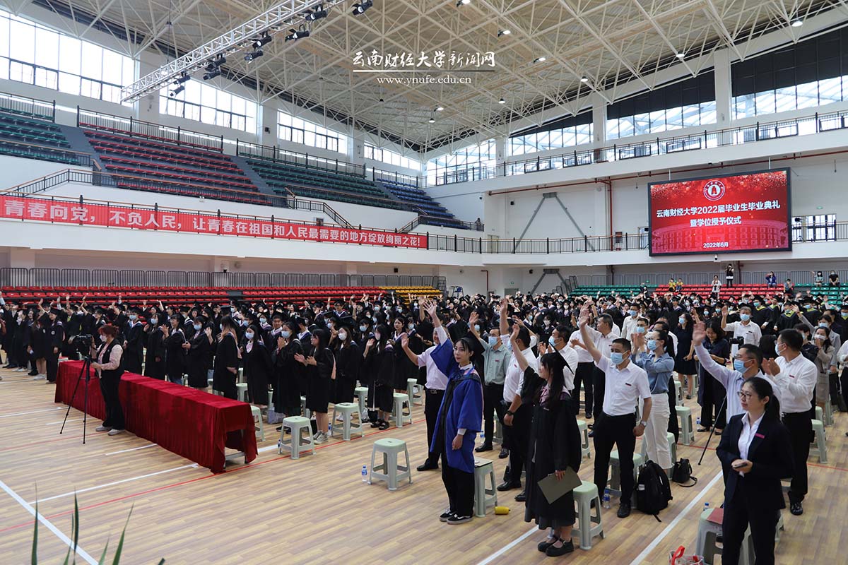 “谨遵师长教诲,铭记母校嘱托,秉承云财校训,弘扬云财精神,立志民族复兴,勇担时代重任,报效祖国,服务人民,奋进新征程,建功新时代!”此次毕业典礼首次安排了宣读毕业誓词的环节,毕业生代表们在领誓人的带领下,面对校旗以铿锵有力的语调齐声宣读毕业誓词。