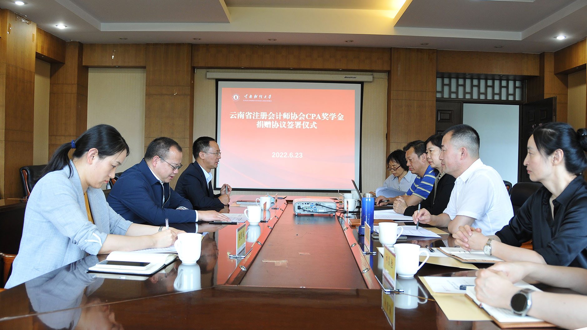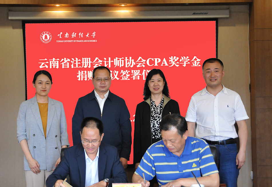 6月23日,云南省注册会计师协会CPA奖学金捐赠协议签署仪式在学校龙泉路校区举行。云南省财政厅副厅长王武,云南省财政厅票据管理中心主任、云南省注册会计师协会秘书长金德华,学校党委委员、副校长王晓萍,云南财经大学教育发展基金会理事长葛茂光出席仪式,仪式由学校党委委员、会计学院院长余怒涛主持。