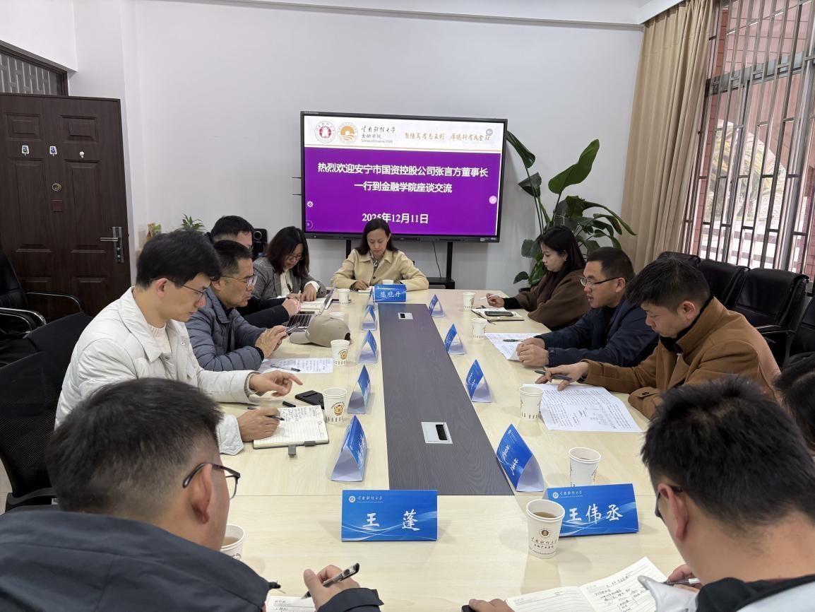 12月11日,安宁市国资控股公司董事长张言方一行到访金融学院,与学院就加强校企合作、推动地方国企改革与高质量发展、国有企业转型、债务优化等共同关注的议题进行深入交流