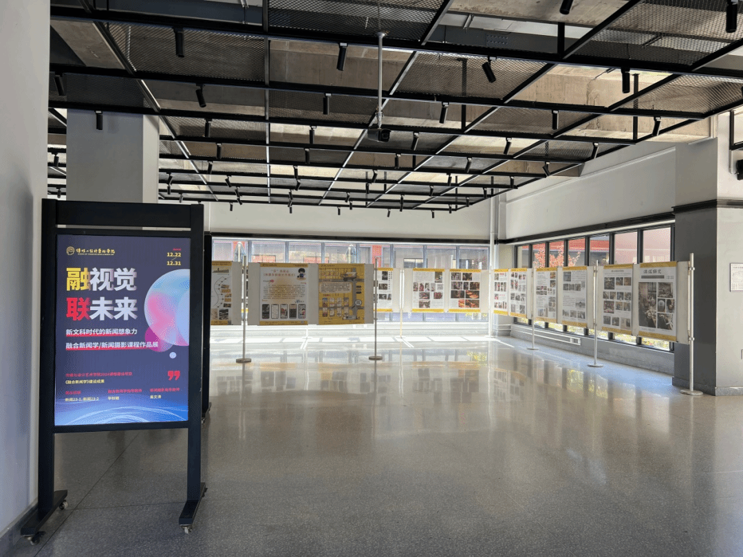 12月22日至31日,传媒与设计艺术学院在安宁校区齐远楼一楼大厅举办课程作品展,展示新闻学专业学生在视觉表达与数字融合方面的实践成果。展览以“融视觉·联未来——新文科时代的新闻想象力”为主题,汇集2022级、2023级本科生课程作品。