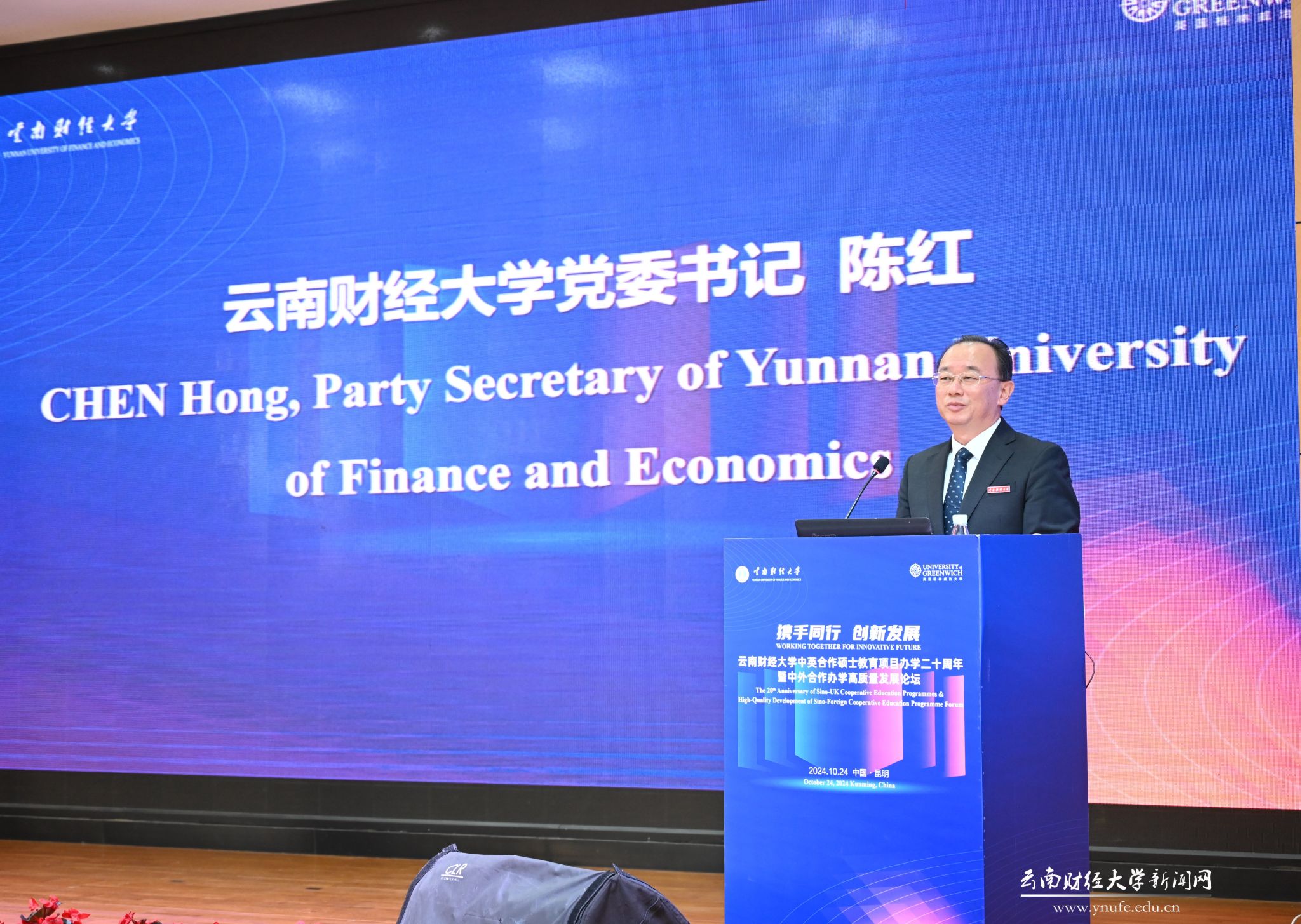 陈红在致辞中表示,二十年的春华秋实,云南财经大学与英国格林威治大学合作举办的硕士学位教育项目从理念碰撞到深度融合,共同见证了学生成才、学科成长、项目成熟的喜人成绩,累计为社会输送具有国际化视野的高素质优秀人才3567人,是学校助力“留学中国·学在云南”品牌建设的有力支撑,也是中英两国教育合作的优秀典范。陈红指出,中外合作办学是高等教育国际化的重要途径,也是推动高等教育改革创新的重要力量。面向未来,云南财经大学将持续深化合作、共谋发展,推动中外合作办学向更高层次、更宽领域、更高质量发展,为社会培养更多具有国际视野、创新精神和实践能力的高素质人才。