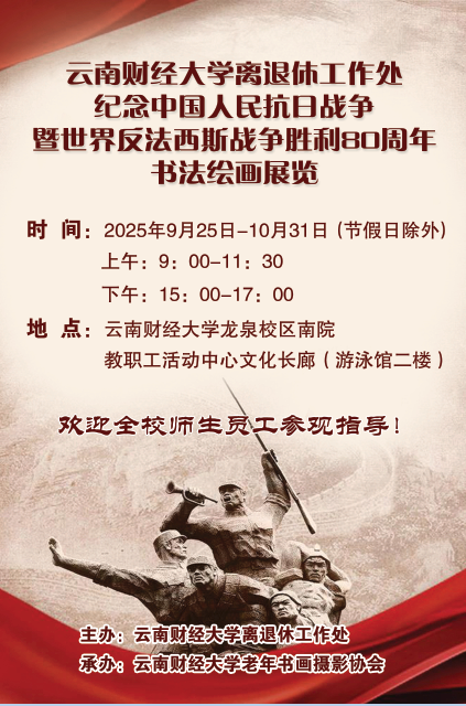 今年是中国人民抗日战争暨世界反法西斯战争胜利80周年。为深切缅怀革命先烈的丰功伟绩,大力弘扬伟大抗战精神,厚植师生爱国情怀,引导师生铭记历史、珍爱和平、砥砺奋进,由我校离退休工作处主办、老年书画摄影协会承办的“纪念中国人民抗日战争暨世界反法西斯战争胜利80周年书法绘画展览”将于近期举办。现将有关事项通知如下: